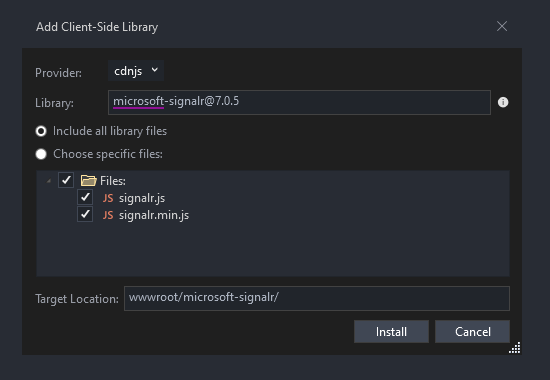 Now we can create a client to connect to this hub. To allow clients to connect, we will need to add the SignalR JavaScript library to our web app. We can do this by adding a new Client Side Library in Visual Studio. Right click on the wwwroot folder and click Add > Client-Side Library.... Then search for signalr and install the @microsoft/signalr package. This will add the SignalR JavaScript library to our web app.